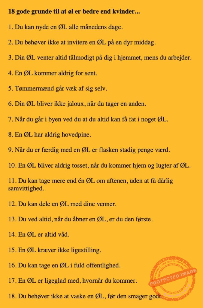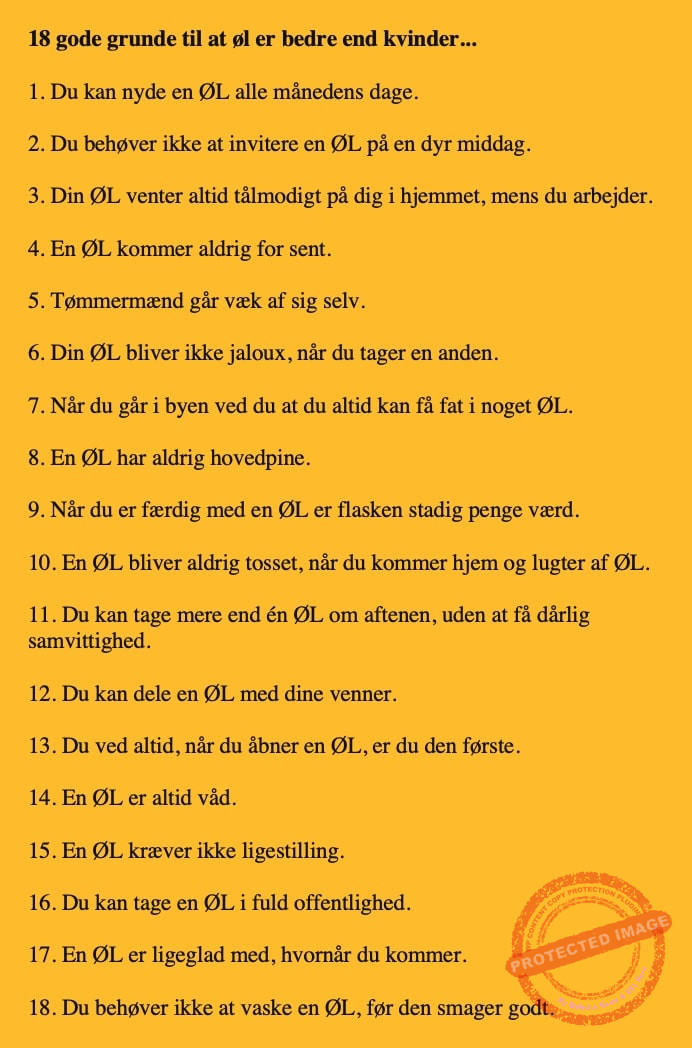 18 gode grunde til at øl er bedre end kvinder… Share on Facebook Tweet on Twitter tweet SCROLL NED FOR FLERE SJOVE JOKES! :) RELATED ARTICLESMORE FROM AUTHOR Vittigheder Lille Michael og boliglånet… Vittigheder Lille Michael ønskede sig en cykel i fødselsdagsgave, men forældrene mente ikke der var penge til det… Vittigheder Peter som ikke var helt så kvik skulle ned og købe kondomer for første gang da han havde fået en kæreste… Vittigheder Lille Lasse havde bandet ved aftensbordet og nu mente hans far han skulle have en røvfuld.. Vittigheder Telefonen ringer hos narkopolitiet… Jeg vil gerne anmeldelse min nabo…. Vittigheder Den mest usandsynlige dartspiller går ind på et værtshus Vittigheder En mand går til lægen, fordi han har et problem med, at han prutter konstant…… Vittigheder En kvinde havde en affære med sin mands ven… Vittigheder En lykkelig gift kvinde ville teste sin mands loyalitet og lavede en test til ham… Vittigheder En mand er ude for at købe en ny papegøje og finder en dyrehandel som har 3 forskellige.. Vittigheder En mand går ind til lægen og siger: “Doktor, jeg tror, jeg er blevet en hund!”…. Vittigheder To venner sidder på en bar og snakker om deres forhold…