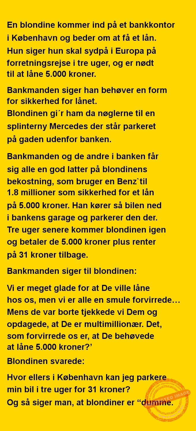 Blondinen var i banken for at låne penge.. Share on Facebook Tweet on Twitter tweet SCROLL NED FOR FLERE SJOVE JOKES! :) RELATED ARTICLESMORE FROM AUTHOR Vittigheder Lille Michael og boliglånet… Vittigheder Lille Michael ønskede sig en cykel i fødselsdagsgave, men forældrene mente ikke der var penge til det… Vittigheder Peter som ikke var helt så kvik skulle ned og købe kondomer for første gang da han havde fået en kæreste… Vittigheder Lille Lasse havde bandet ved aftensbordet og nu mente hans far han skulle have en røvfuld.. Vittigheder Telefonen ringer hos narkopolitiet… Jeg vil gerne anmeldelse min nabo…. Vittigheder Den mest usandsynlige dartspiller går ind på et værtshus Vittigheder En mand går til lægen, fordi han har et problem med, at han prutter konstant…… Vittigheder En kvinde havde en affære med sin mands ven… Vittigheder En lykkelig gift kvinde ville teste sin mands loyalitet og lavede en test til ham… Vittigheder En mand er ude for at købe en ny papegøje og finder en dyrehandel som har 3 forskellige.. Vittigheder En mand går ind til lægen og siger: “Doktor, jeg tror, jeg er blevet en hund!”…. Vittigheder To venner sidder på en bar og snakker om deres forhold…
