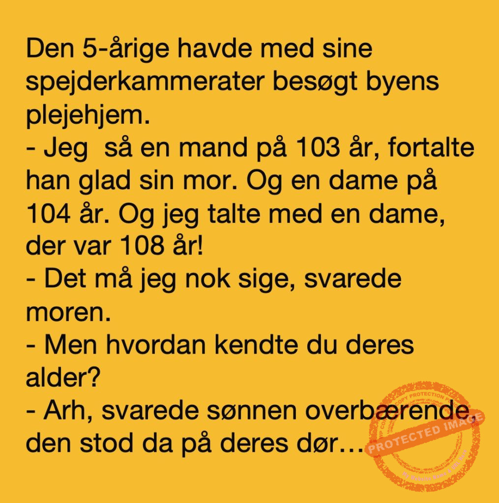 Den 5-årige havde med sine spejderkammerater besøgt byens plejehjem Share on Facebook Tweet on Twitter tweet SCROLL NED FOR FLERE SJOVE JOKES! :) RELATED ARTICLESMORE FROM AUTHOR Vittigheder Lille Michael og boliglånet… Vittigheder Lille Michael ønskede sig en cykel i fødselsdagsgave, men forældrene mente ikke der var penge til det… Vittigheder Peter som ikke var helt så kvik skulle ned og købe kondomer for første gang da han havde fået en kæreste… Vittigheder Lille Lasse havde bandet ved aftensbordet og nu mente hans far han skulle have en røvfuld.. Vittigheder Telefonen ringer hos narkopolitiet… Jeg vil gerne anmeldelse min nabo…. Vittigheder Den mest usandsynlige dartspiller går ind på et værtshus Vittigheder En mand går til lægen, fordi han har et problem med, at han prutter konstant…… Vittigheder En kvinde havde en affære med sin mands ven… Vittigheder En lykkelig gift kvinde ville teste sin mands loyalitet og lavede en test til ham… Vittigheder En mand er ude for at købe en ny papegøje og finder en dyrehandel som har 3 forskellige.. Vittigheder En mand går ind til lægen og siger: “Doktor, jeg tror, jeg er blevet en hund!”…. Vittigheder To venner sidder på en bar og snakker om deres forhold…