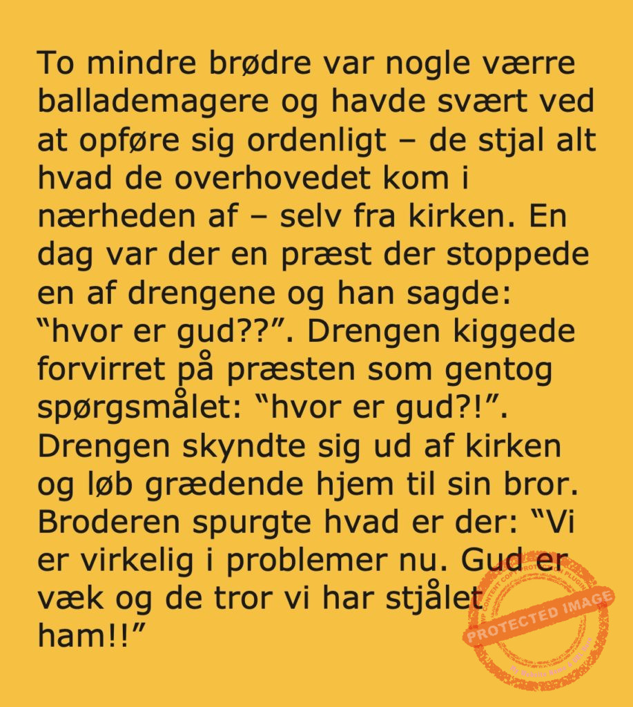 To små brødre var nogle værre ballademagere og en dag blev de stoppet af en præst på gaden.. Share on Facebook Tweet on Twitter tweet SCROLL NED FOR FLERE SJOVE JOKES! :) RELATED ARTICLESMORE FROM AUTHOR Vittigheder Lille Michael og boliglånet… Vittigheder Lille Michael ønskede sig en cykel i fødselsdagsgave, men forældrene mente ikke der var penge til det… Vittigheder Peter som ikke var helt så kvik skulle ned og købe kondomer for første gang da han havde fået en kæreste… Vittigheder Lille Lasse havde bandet ved aftensbordet og nu mente hans far han skulle have en røvfuld.. Vittigheder Telefonen ringer hos narkopolitiet… Jeg vil gerne anmeldelse min nabo…. Vittigheder Den mest usandsynlige dartspiller går ind på et værtshus Vittigheder En mand går til lægen, fordi han har et problem med, at han prutter konstant…… Vittigheder En kvinde havde en affære med sin mands ven… Vittigheder En lykkelig gift kvinde ville teste sin mands loyalitet og lavede en test til ham… Vittigheder En mand er ude for at købe en ny papegøje og finder en dyrehandel som har 3 forskellige.. Vittigheder En mand går ind til lægen og siger: “Doktor, jeg tror, jeg er blevet en hund!”…. Vittigheder To venner sidder på en bar og snakker om deres forhold…