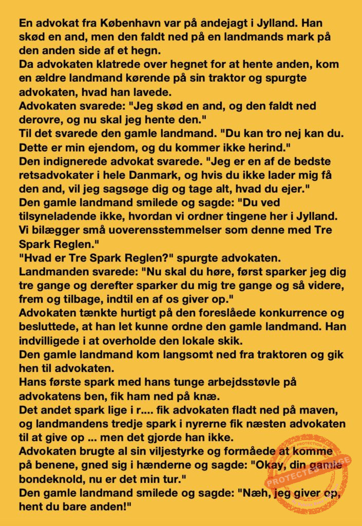 En advokat fra København var på andejagt i Jylland… Share on Facebook Tweet on Twitter tweet SCROLL NED FOR FLERE SJOVE JOKES! :) RELATED ARTICLESMORE FROM AUTHOR Vittigheder Lille Michael og boliglånet… Vittigheder Lille Michael ønskede sig en cykel i fødselsdagsgave, men forældrene mente ikke der var penge til det… Vittigheder Peter som ikke var helt så kvik skulle ned og købe kondomer for første gang da han havde fået en kæreste… Vittigheder Lille Lasse havde bandet ved aftensbordet og nu mente hans far han skulle have en røvfuld.. Vittigheder Telefonen ringer hos narkopolitiet… Jeg vil gerne anmeldelse min nabo…. Vittigheder Den mest usandsynlige dartspiller går ind på et værtshus Vittigheder En mand går til lægen, fordi han har et problem med, at han prutter konstant…… Vittigheder En kvinde havde en affære med sin mands ven… Vittigheder En lykkelig gift kvinde ville teste sin mands loyalitet og lavede en test til ham… Vittigheder En mand er ude for at købe en ny papegøje og finder en dyrehandel som har 3 forskellige.. Vittigheder En mand går ind til lægen og siger: “Doktor, jeg tror, jeg er blevet en hund!”…. Vittigheder To venner sidder på en bar og snakker om deres forhold…