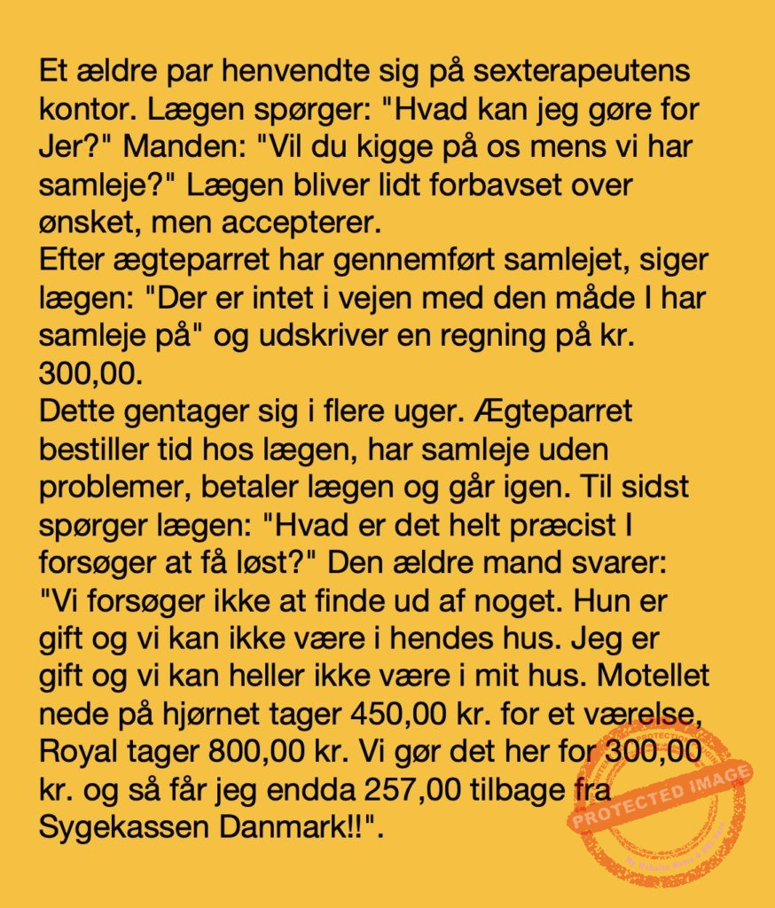 En ældre par henvender sig til en læge om han vil kigge på mens de laver det frække… Share on Facebook Tweet on Twitter tweet SCROLL NED FOR FLERE SJOVE JOKES! :) RELATED ARTICLESMORE FROM AUTHOR Vittigheder Lille Michael og boliglånet… Vittigheder Lille Michael ønskede sig en cykel i fødselsdagsgave, men forældrene mente ikke der var penge til det… Vittigheder Peter som ikke var helt så kvik skulle ned og købe kondomer for første gang da han havde fået en kæreste… Vittigheder Lille Lasse havde bandet ved aftensbordet og nu mente hans far han skulle have en røvfuld.. Vittigheder Telefonen ringer hos narkopolitiet… Jeg vil gerne anmeldelse min nabo…. Vittigheder Den mest usandsynlige dartspiller går ind på et værtshus Vittigheder En mand går til lægen, fordi han har et problem med, at han prutter konstant…… Vittigheder En kvinde havde en affære med sin mands ven… Vittigheder En lykkelig gift kvinde ville teste sin mands loyalitet og lavede en test til ham… Vittigheder En mand er ude for at købe en ny papegøje og finder en dyrehandel som har 3 forskellige.. Vittigheder En mand går ind til lægen og siger: “Doktor, jeg tror, jeg er blevet en hund!”…. Vittigheder To venner sidder på en bar og snakker om deres forhold…
