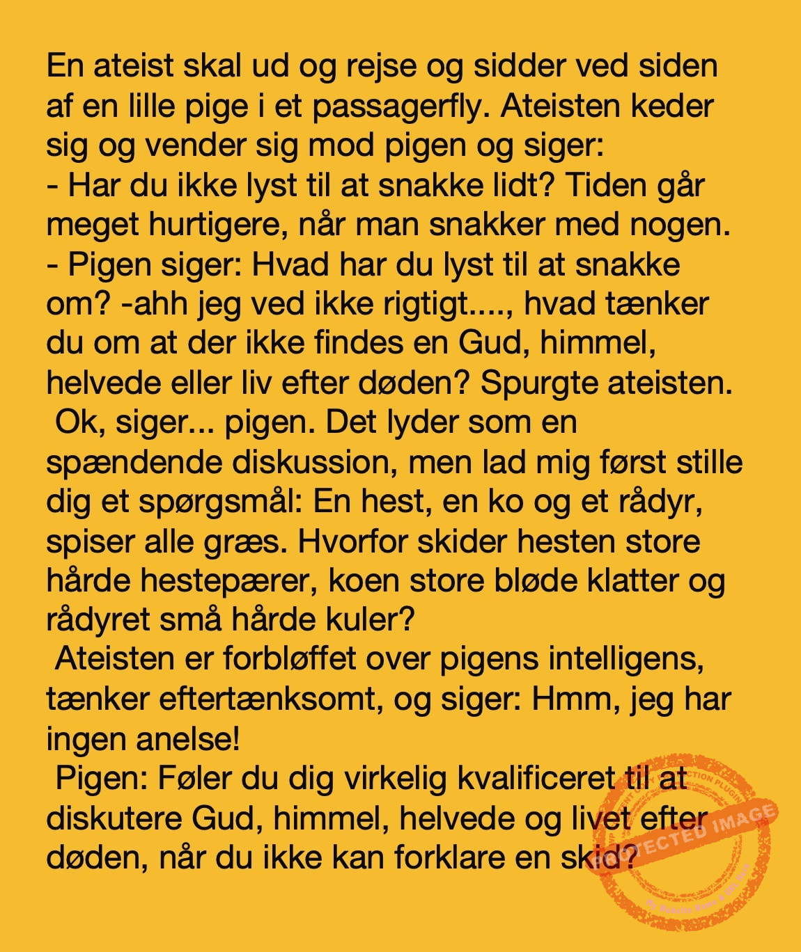 En ateist skal ud og rejse og sidder ved siden af en lille pige i et passagerfly Share on Facebook Tweet on Twitter tweet SCROLL NED FOR FLERE SJOVE JOKES! :) RELATED ARTICLESMORE FROM AUTHOR Vittigheder Lille Michael og boliglĂĄnet… Vittigheder Lille Michael ønskede sig en cykel i fødselsdagsgave, men forældrene mente ikke der var penge til det… Vittigheder Peter som ikke var helt sĂĄ kvik skulle ned og købe kondomer for første gang da han havde fĂĄet en kæreste… Vittigheder Lille Lasse havde bandet ved aftensbordet og nu mente hans far han skulle have en røvfuld.. Vittigheder Telefonen ringer hos narkopolitiet… Jeg vil gerne anmeldelse min nabo…. Vittigheder Den mest usandsynlige dartspiller gĂĄr ind pĂĄ et værtshus Vittigheder En mand gĂĄr til lægen, fordi han har et problem med, at han prutter konstant…… Vittigheder En kvinde havde en affære med sin mands ven… Vittigheder En lykkelig gift kvinde ville teste sin mands loyalitet og lavede en test til ham… Vittigheder En mand er ude for at købe en ny papegøje og finder en dyrehandel som har 3 forskellige.. Vittigheder En mand gĂĄr ind til lægen og siger: “Doktor, jeg tror, jeg er blevet en hund!”…. Vittigheder To venner sidder pĂĄ en bar og snakker om deres forhold…