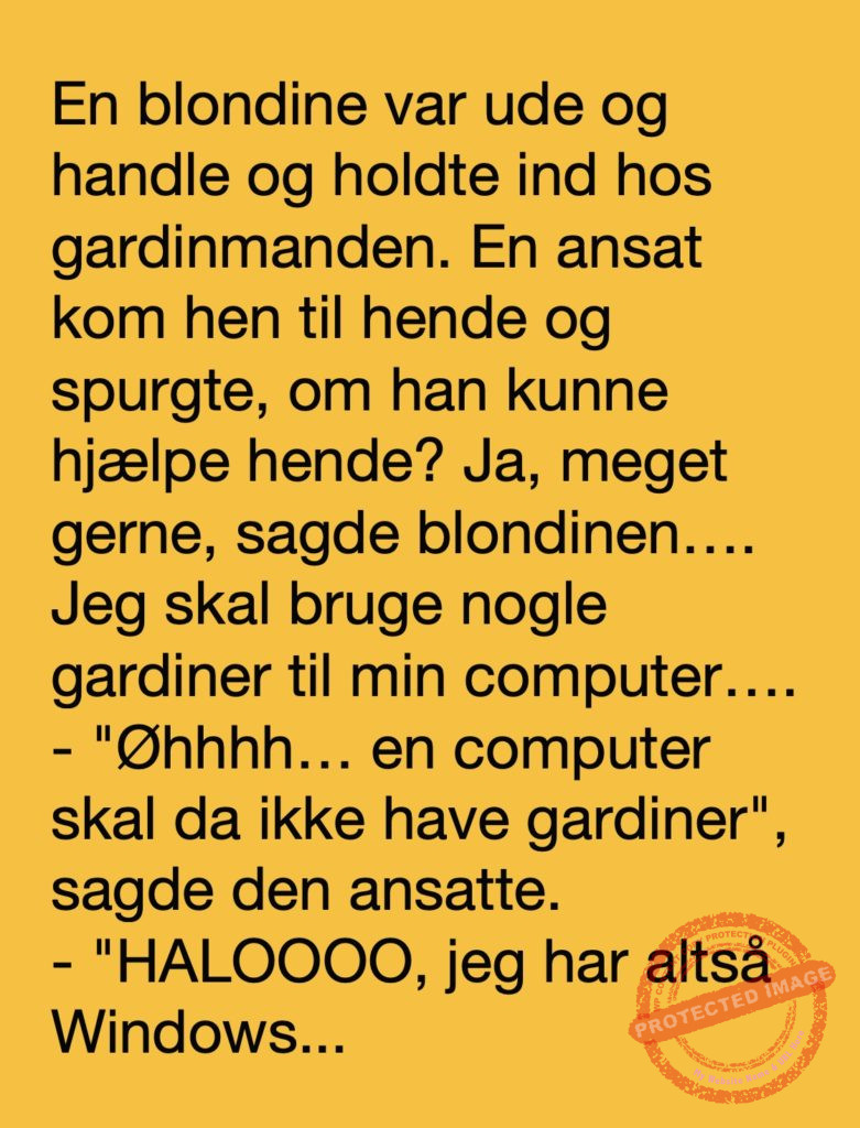 En blondine er ude at købe nye gardiner…. Share on Facebook Tweet on Twitter tweet SCROLL NED FOR FLERE SJOVE JOKES! :) RELATED ARTICLESMORE FROM AUTHOR Vittigheder Lille Michael og boliglånet… Vittigheder Lille Michael ønskede sig en cykel i fødselsdagsgave, men forældrene mente ikke der var penge til det… Vittigheder Peter som ikke var helt så kvik skulle ned og købe kondomer for første gang da han havde fået en kæreste… Vittigheder Lille Lasse havde bandet ved aftensbordet og nu mente hans far han skulle have en røvfuld.. Vittigheder Telefonen ringer hos narkopolitiet… Jeg vil gerne anmeldelse min nabo…. Vittigheder Den mest usandsynlige dartspiller går ind på et værtshus Vittigheder En mand går til lægen, fordi han har et problem med, at han prutter konstant…… Vittigheder En kvinde havde en affære med sin mands ven… Vittigheder En lykkelig gift kvinde ville teste sin mands loyalitet og lavede en test til ham… Vittigheder En mand er ude for at købe en ny papegøje og finder en dyrehandel som har 3 forskellige.. Vittigheder En mand går ind til lægen og siger: “Doktor, jeg tror, jeg er blevet en hund!”…. Vittigheder To venner sidder på en bar og snakker om deres forhold…