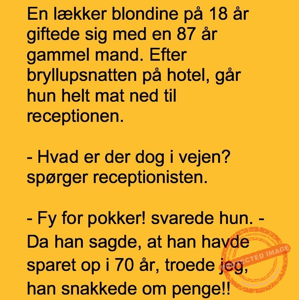 En lækker blondine giftede sig med en gammel mand.. Share on Facebook Tweet on Twitter tweet SCROLL NED FOR FLERE SJOVE JOKES! :) RELATED ARTICLESMORE FROM AUTHOR Vittigheder Lille Michael og boliglånet… Vittigheder Lille Michael ønskede sig en cykel i fødselsdagsgave, men forældrene mente ikke der var penge til det… Vittigheder Peter som ikke var helt så kvik skulle ned og købe kondomer for første gang da han havde fået en kæreste… Vittigheder Lille Lasse havde bandet ved aftensbordet og nu mente hans far han skulle have en røvfuld.. Vittigheder Telefonen ringer hos narkopolitiet… Jeg vil gerne anmeldelse min nabo…. Vittigheder Den mest usandsynlige dartspiller går ind på et værtshus Vittigheder En mand går til lægen, fordi han har et problem med, at han prutter konstant…… Vittigheder En kvinde havde en affære med sin mands ven… Vittigheder En lykkelig gift kvinde ville teste sin mands loyalitet og lavede en test til ham… Vittigheder En mand er ude for at købe en ny papegøje og finder en dyrehandel som har 3 forskellige.. Vittigheder En mand går ind til lægen og siger: “Doktor, jeg tror, jeg er blevet en hund!”…. Vittigheder To venner sidder på en bar og snakker om deres forhold…