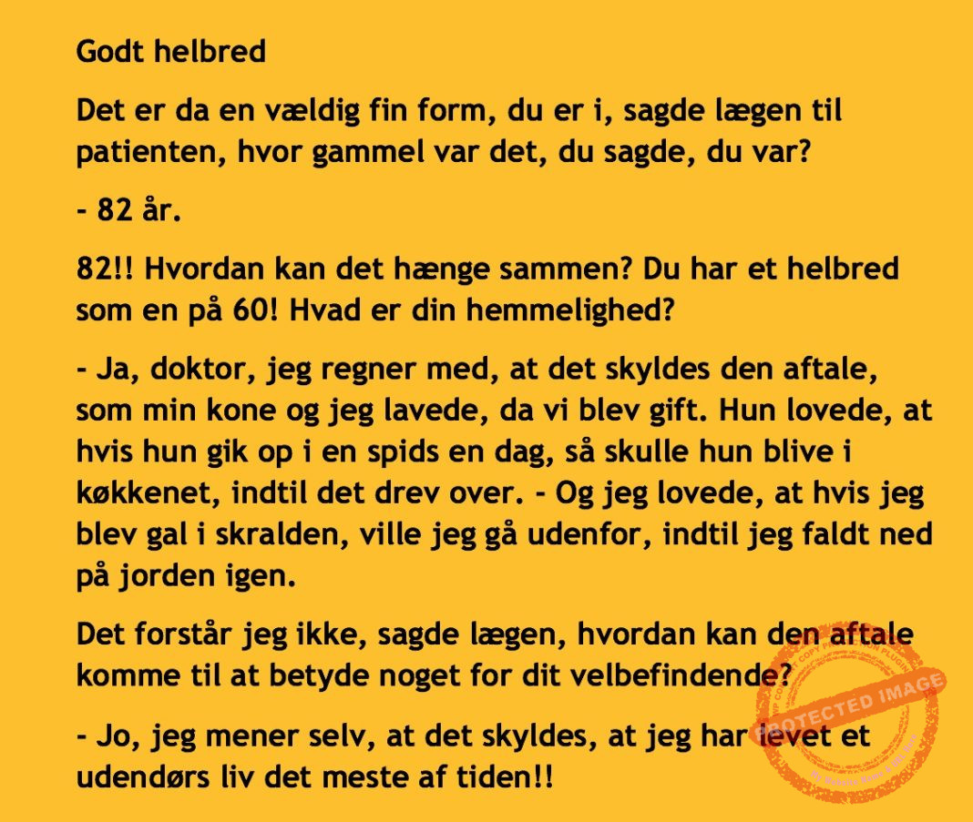 Et godt helbred…. Share on Facebook Tweet on Twitter tweet SCROLL NED FOR FLERE SJOVE JOKES! :) RELATED ARTICLESMORE FROM AUTHOR Vittigheder Lille Michael og boliglĂĄnet… Vittigheder Lille Michael ønskede sig en cykel i fødselsdagsgave, men forældrene mente ikke der var penge til det… Vittigheder Peter som ikke var helt sĂĄ kvik skulle ned og købe kondomer for første gang da han havde fĂĄet en kæreste… Vittigheder Lille Lasse havde bandet ved aftensbordet og nu mente hans far han skulle have en røvfuld.. Vittigheder Telefonen ringer hos narkopolitiet… Jeg vil gerne anmeldelse min nabo…. Vittigheder Den mest usandsynlige dartspiller gĂĄr ind pĂĄ et værtshus Vittigheder En mand gĂĄr til lægen, fordi han har et problem med, at han prutter konstant…… Vittigheder En kvinde havde en affære med sin mands ven… Vittigheder En lykkelig gift kvinde ville teste sin mands loyalitet og lavede en test til ham… Vittigheder En mand er ude for at købe en ny papegøje og finder en dyrehandel som har 3 forskellige.. Vittigheder En mand gĂĄr ind til lægen og siger: “Doktor, jeg tror, jeg er blevet en hund!”…. Vittigheder To venner sidder pĂĄ en bar og snakker om deres forhold…