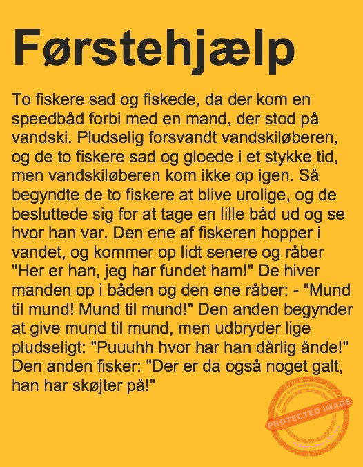 Førstehjælp på vandet Share on Facebook Tweet on Twitter tweet SCROLL NED FOR FLERE SJOVE JOKES! :) RELATED ARTICLESMORE FROM AUTHOR Vittigheder Lille Michael og boliglånet… Vittigheder Lille Michael ønskede sig en cykel i fødselsdagsgave, men forældrene mente ikke der var penge til det… Vittigheder Peter som ikke var helt så kvik skulle ned og købe kondomer for første gang da han havde fået en kæreste… Vittigheder Lille Lasse havde bandet ved aftensbordet og nu mente hans far han skulle have en røvfuld.. Vittigheder Telefonen ringer hos narkopolitiet… Jeg vil gerne anmeldelse min nabo…. Vittigheder Den mest usandsynlige dartspiller går ind på et værtshus Vittigheder En mand går til lægen, fordi han har et problem med, at han prutter konstant…… Vittigheder En kvinde havde en affære med sin mands ven… Vittigheder En lykkelig gift kvinde ville teste sin mands loyalitet og lavede en test til ham… Vittigheder En mand er ude for at købe en ny papegøje og finder en dyrehandel som har 3 forskellige.. Vittigheder En mand går ind til lægen og siger: “Doktor, jeg tror, jeg er blevet en hund!”…. Vittigheder To venner sidder på en bar og snakker om deres forhold…