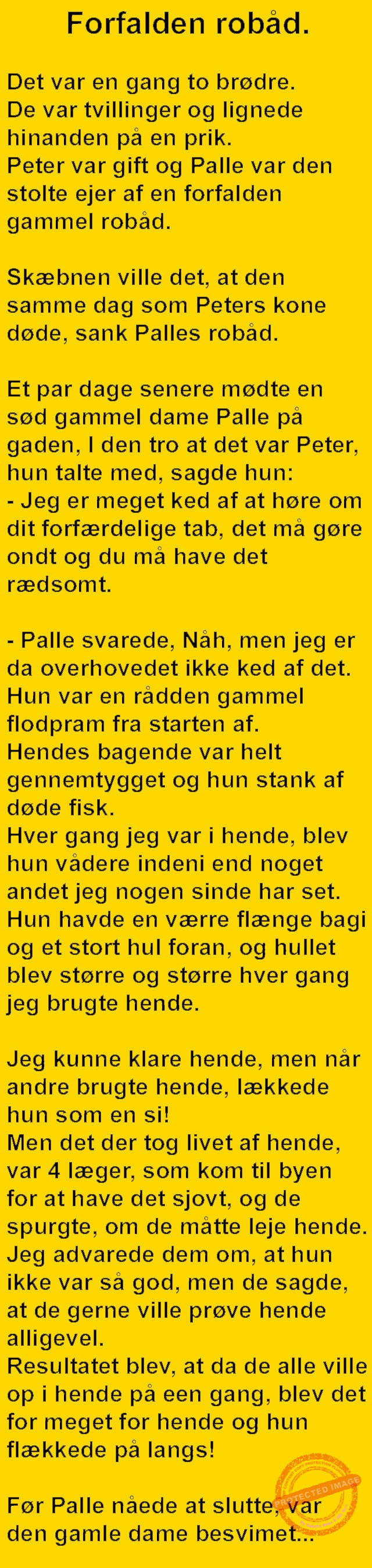 Forfalden robåd… Share on Facebook Tweet on Twitter tweet SCROLL NED FOR FLERE SJOVE JOKES! :) RELATED ARTICLESMORE FROM AUTHOR Vittigheder Lille Michael og boliglånet… Vittigheder Lille Michael ønskede sig en cykel i fødselsdagsgave, men forældrene mente ikke der var penge til det… Vittigheder Peter som ikke var helt så kvik skulle ned og købe kondomer for første gang da han havde fået en kæreste… Vittigheder Lille Lasse havde bandet ved aftensbordet og nu mente hans far han skulle have en røvfuld.. Vittigheder Telefonen ringer hos narkopolitiet… Jeg vil gerne anmeldelse min nabo…. Vittigheder Den mest usandsynlige dartspiller går ind på et værtshus Vittigheder En mand går til lægen, fordi han har et problem med, at han prutter konstant…… Vittigheder En kvinde havde en affære med sin mands ven… Vittigheder En lykkelig gift kvinde ville teste sin mands loyalitet og lavede en test til ham… Vittigheder En mand er ude for at købe en ny papegøje og finder en dyrehandel som har 3 forskellige.. Vittigheder En mand går ind til lægen og siger: “Doktor, jeg tror, jeg er blevet en hund!”…. Vittigheder To venner sidder på en bar og snakker om deres forhold…