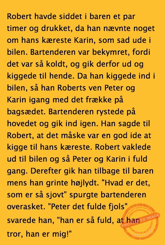 Fulde Robert sidder i baren Share on Facebook Tweet on Twitter tweet SCROLL NED FOR FLERE SJOVE JOKES! :) RELATED ARTICLESMORE FROM AUTHOR Vittigheder Lille Michael og boliglĂĄnet… Vittigheder Lille Michael ønskede sig en cykel i fødselsdagsgave, men forældrene mente ikke der var penge til det… Vittigheder Peter som ikke var helt sĂĄ kvik skulle ned og købe kondomer for første gang da han havde fĂĄet en kæreste… Vittigheder Lille Lasse havde bandet ved aftensbordet og nu mente hans far han skulle have en røvfuld.. Vittigheder Telefonen ringer hos narkopolitiet… Jeg vil gerne anmeldelse min nabo…. Vittigheder Den mest usandsynlige dartspiller gĂĄr ind pĂĄ et værtshus Vittigheder En mand gĂĄr til lægen, fordi han har et problem med, at han prutter konstant…… Vittigheder En kvinde havde en affære med sin mands ven… Vittigheder En lykkelig gift kvinde ville teste sin mands loyalitet og lavede en test til ham… Vittigheder En mand er ude for at købe en ny papegøje og finder en dyrehandel som har 3 forskellige.. Vittigheder En mand gĂĄr ind til lægen og siger: “Doktor, jeg tror, jeg er blevet en hund!”…. Vittigheder To venner sidder pĂĄ en bar og snakker om deres forhold…