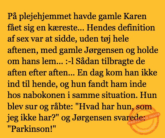 Gamle Karen på plejehjemmet havde fået sig en kæreste… Share on Facebook Tweet on Twitter tweet SCROLL NED FOR FLERE SJOVE JOKES! :) RELATED ARTICLESMORE FROM AUTHOR Vittigheder Lille Michael og boliglånet… Vittigheder Lille Michael ønskede sig en cykel i fødselsdagsgave, men forældrene mente ikke der var penge til det… Vittigheder Peter som ikke var helt så kvik skulle ned og købe kondomer for første gang da han havde fået en kæreste… Vittigheder Lille Lasse havde bandet ved aftensbordet og nu mente hans far han skulle have en røvfuld.. Vittigheder Telefonen ringer hos narkopolitiet… Jeg vil gerne anmeldelse min nabo…. Vittigheder Den mest usandsynlige dartspiller går ind på et værtshus Vittigheder En mand går til lægen, fordi han har et problem med, at han prutter konstant…… Vittigheder En kvinde havde en affære med sin mands ven… Vittigheder En lykkelig gift kvinde ville teste sin mands loyalitet og lavede en test til ham… Vittigheder En mand er ude for at købe en ny papegøje og finder en dyrehandel som har 3 forskellige.. Vittigheder En mand går ind til lægen og siger: “Doktor, jeg tror, jeg er blevet en hund!”…. Vittigheder To venner sidder på en bar og snakker om deres forhold…