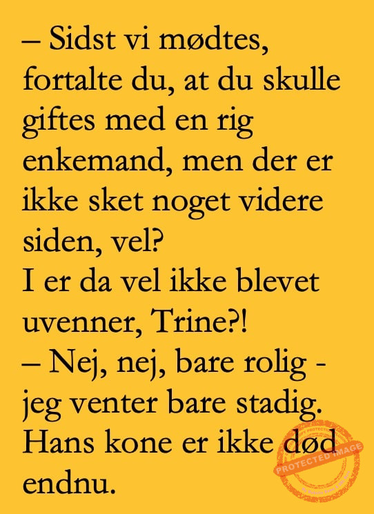 To veninder snakker om deres forhold og drømme… Share on Facebook Tweet on Twitter tweet giftesmedenrig SCROLL NED FOR FLERE SJOVE JOKES! :) RELATED ARTICLESMORE FROM AUTHOR Vittigheder Lille Michael og boliglånet… Vittigheder Lille Michael ønskede sig en cykel i fødselsdagsgave, men forældrene mente ikke der var penge til det… Vittigheder Peter som ikke var helt så kvik skulle ned og købe kondomer for første gang da han havde fået en kæreste… Vittigheder Lille Lasse havde bandet ved aftensbordet og nu mente hans far han skulle have en røvfuld.. Vittigheder Telefonen ringer hos narkopolitiet… Jeg vil gerne anmeldelse min nabo…. Vittigheder Den mest usandsynlige dartspiller går ind på et værtshus Vittigheder En mand går til lægen, fordi han har et problem med, at han prutter konstant…… Vittigheder En kvinde havde en affære med sin mands ven… Vittigheder En lykkelig gift kvinde ville teste sin mands loyalitet og lavede en test til ham… Vittigheder En mand er ude for at købe en ny papegøje og finder en dyrehandel som har 3 forskellige.. Vittigheder En mand går ind til lægen og siger: “Doktor, jeg tror, jeg er blevet en hund!”…. Vittigheder To venner sidder på en bar og snakker om deres forhold…