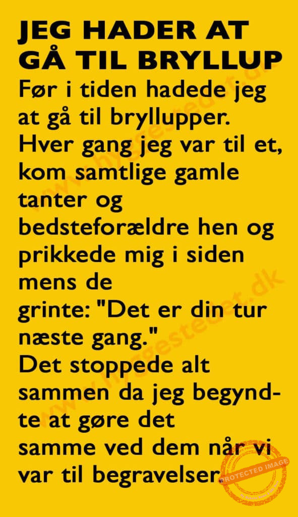 Jeg hader at gå til bryllup… Share on Facebook Tweet on Twitter tweet SCROLL NED FOR FLERE SJOVE JOKES! :) RELATED ARTICLESMORE FROM AUTHOR Vittigheder Lille Michael og boliglånet… Vittigheder Lille Michael ønskede sig en cykel i fødselsdagsgave, men forældrene mente ikke der var penge til det… Vittigheder Peter som ikke var helt så kvik skulle ned og købe kondomer for første gang da han havde fået en kæreste… Vittigheder Lille Lasse havde bandet ved aftensbordet og nu mente hans far han skulle have en røvfuld.. Vittigheder Telefonen ringer hos narkopolitiet… Jeg vil gerne anmeldelse min nabo…. Vittigheder Den mest usandsynlige dartspiller går ind på et værtshus Vittigheder En mand går til lægen, fordi han har et problem med, at han prutter konstant…… Vittigheder En kvinde havde en affære med sin mands ven… Vittigheder En lykkelig gift kvinde ville teste sin mands loyalitet og lavede en test til ham… Vittigheder En mand er ude for at købe en ny papegøje og finder en dyrehandel som har 3 forskellige.. Vittigheder En mand går ind til lægen og siger: “Doktor, jeg tror, jeg er blevet en hund!”…. Vittigheder To venner sidder på en bar og snakker om deres forhold…
