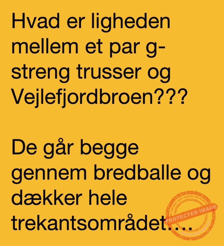 Hvad er ligheden mellem et par g-streng trusser og Vejlefjordbroen??? Share on Facebook Tweet on Twitter tweet SCROLL NED FOR FLERE SJOVE JOKES! :) RELATED ARTICLESMORE FROM AUTHOR Vittigheder Lille Michael og boliglĂĄnet… Vittigheder Lille Michael ønskede sig en cykel i fødselsdagsgave, men forældrene mente ikke der var penge til det… Vittigheder Peter som ikke var helt sĂĄ kvik skulle ned og købe kondomer for første gang da han havde fĂĄet en kæreste… Vittigheder Lille Lasse havde bandet ved aftensbordet og nu mente hans far han skulle have en røvfuld.. Vittigheder Telefonen ringer hos narkopolitiet… Jeg vil gerne anmeldelse min nabo…. Vittigheder Den mest usandsynlige dartspiller gĂĄr ind pĂĄ et værtshus Vittigheder En mand gĂĄr til lægen, fordi han har et problem med, at han prutter konstant…… Vittigheder En kvinde havde en affære med sin mands ven… Vittigheder En lykkelig gift kvinde ville teste sin mands loyalitet og lavede en test til ham… Vittigheder En mand er ude for at købe en ny papegøje og finder en dyrehandel som har 3 forskellige.. Vittigheder En mand gĂĄr ind til lægen og siger: “Doktor, jeg tror, jeg er blevet en hund!”…. Vittigheder To venner sidder pĂĄ en bar og snakker om deres forhold…