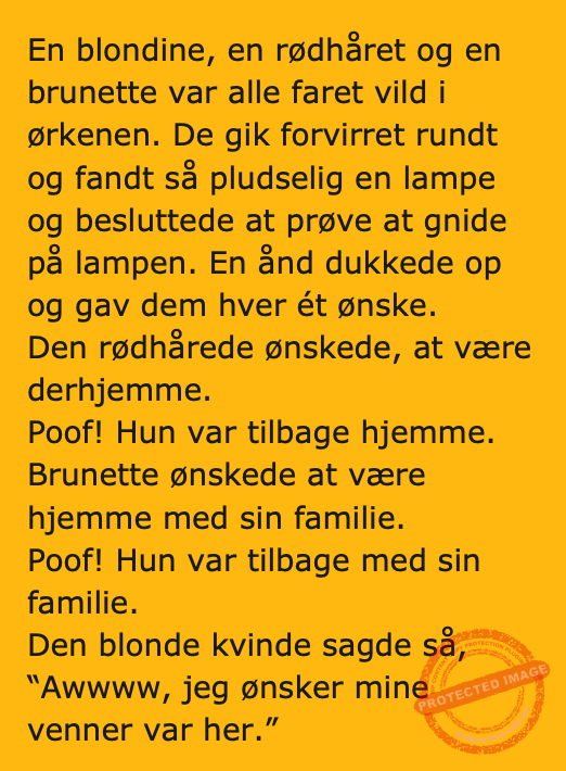 En blondine, en rødhåret og en brunette er faret vild i ørkenen Share on Facebook Tweet on Twitter tweet SCROLL NED FOR FLERE SJOVE JOKES! :) RELATED ARTICLESMORE FROM AUTHOR Vittigheder Lille Michael og boliglånet… Vittigheder Lille Michael ønskede sig en cykel i fødselsdagsgave, men forældrene mente ikke der var penge til det… Vittigheder Peter som ikke var helt så kvik skulle ned og købe kondomer for første gang da han havde fået en kæreste… Vittigheder Lille Lasse havde bandet ved aftensbordet og nu mente hans far han skulle have en røvfuld.. Vittigheder Telefonen ringer hos narkopolitiet… Jeg vil gerne anmeldelse min nabo…. Vittigheder Den mest usandsynlige dartspiller går ind på et værtshus Vittigheder En mand går til lægen, fordi han har et problem med, at han prutter konstant…… Vittigheder En kvinde havde en affære med sin mands ven… Vittigheder En lykkelig gift kvinde ville teste sin mands loyalitet og lavede en test til ham… Vittigheder En mand er ude for at købe en ny papegøje og finder en dyrehandel som har 3 forskellige.. Vittigheder En mand går ind til lægen og siger: “Doktor, jeg tror, jeg er blevet en hund!”…. Vittigheder To venner sidder på en bar og snakker om deres forhold…