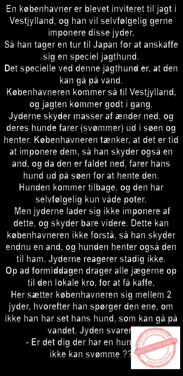 Københavneren der skulle på jagt i Vestjylland… Share on Facebook Tweet on Twitter tweet SCROLL NED FOR FLERE SJOVE JOKES! :) RELATED ARTICLESMORE FROM AUTHOR Vittigheder Lille Michael og boliglånet… Vittigheder Lille Michael ønskede sig en cykel i fødselsdagsgave, men forældrene mente ikke der var penge til det… Vittigheder Peter som ikke var helt så kvik skulle ned og købe kondomer for første gang da han havde fået en kæreste… Vittigheder Lille Lasse havde bandet ved aftensbordet og nu mente hans far han skulle have en røvfuld.. Vittigheder Telefonen ringer hos narkopolitiet… Jeg vil gerne anmeldelse min nabo…. Vittigheder Den mest usandsynlige dartspiller går ind på et værtshus Vittigheder En mand går til lægen, fordi han har et problem med, at han prutter konstant…… Vittigheder En kvinde havde en affære med sin mands ven… Vittigheder En lykkelig gift kvinde ville teste sin mands loyalitet og lavede en test til ham… Vittigheder En mand er ude for at købe en ny papegøje og finder en dyrehandel som har 3 forskellige.. Vittigheder En mand går ind til lægen og siger: “Doktor, jeg tror, jeg er blevet en hund!”…. Vittigheder To venner sidder på en bar og snakker om deres forhold…