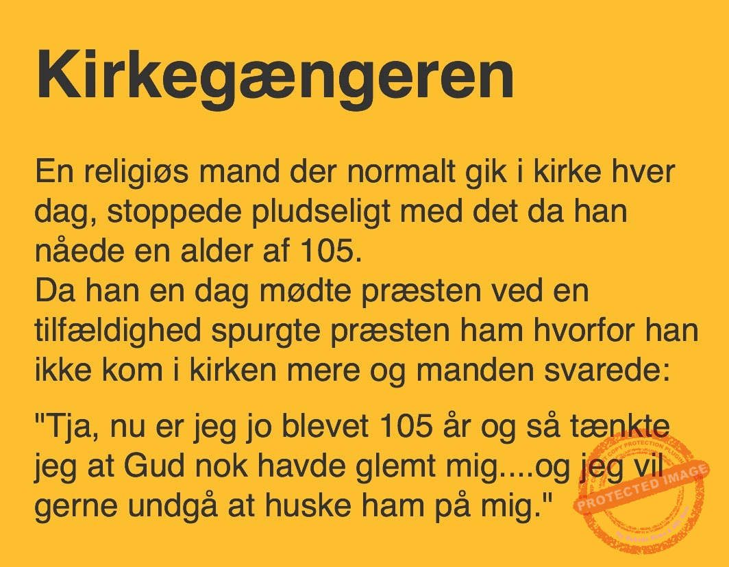 Kirkegængeren Share on Facebook Tweet on Twitter tweet SCROLL NED FOR FLERE SJOVE JOKES! :) RELATED ARTICLESMORE FROM AUTHOR Vittigheder Lille Michael og boliglånet… Vittigheder Lille Michael ønskede sig en cykel i fødselsdagsgave, men forældrene mente ikke der var penge til det… Vittigheder Peter som ikke var helt så kvik skulle ned og købe kondomer for første gang da han havde fået en kæreste… Vittigheder Lille Lasse havde bandet ved aftensbordet og nu mente hans far han skulle have en røvfuld.. Vittigheder Telefonen ringer hos narkopolitiet… Jeg vil gerne anmeldelse min nabo…. Vittigheder Den mest usandsynlige dartspiller går ind på et værtshus Vittigheder En mand går til lægen, fordi han har et problem med, at han prutter konstant…… Vittigheder En kvinde havde en affære med sin mands ven… Vittigheder En lykkelig gift kvinde ville teste sin mands loyalitet og lavede en test til ham… Vittigheder En mand er ude for at købe en ny papegøje og finder en dyrehandel som har 3 forskellige.. Vittigheder En mand går ind til lægen og siger: “Doktor, jeg tror, jeg er blevet en hund!”…. Vittigheder To venner sidder på en bar og snakker om deres forhold…