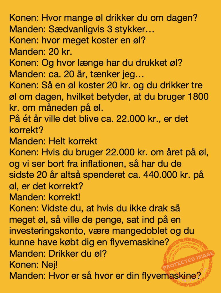 Mænds logik…. Share on Facebook Tweet on Twitter tweet SCROLL NED FOR FLERE SJOVE JOKES! :) RELATED ARTICLESMORE FROM AUTHOR Vittigheder Lille Michael og boliglånet… Vittigheder Lille Michael ønskede sig en cykel i fødselsdagsgave, men forældrene mente ikke der var penge til det… Vittigheder Peter som ikke var helt så kvik skulle ned og købe kondomer for første gang da han havde fået en kæreste… Vittigheder Lille Lasse havde bandet ved aftensbordet og nu mente hans far han skulle have en røvfuld.. Vittigheder Telefonen ringer hos narkopolitiet… Jeg vil gerne anmeldelse min nabo…. Vittigheder Den mest usandsynlige dartspiller går ind på et værtshus Vittigheder En mand går til lægen, fordi han har et problem med, at han prutter konstant…… Vittigheder En kvinde havde en affære med sin mands ven… Vittigheder En lykkelig gift kvinde ville teste sin mands loyalitet og lavede en test til ham… Vittigheder En mand er ude for at købe en ny papegøje og finder en dyrehandel som har 3 forskellige.. Vittigheder En mand går ind til lægen og siger: “Doktor, jeg tror, jeg er blevet en hund!”…. Vittigheder To venner sidder på en bar og snakker om deres forhold…