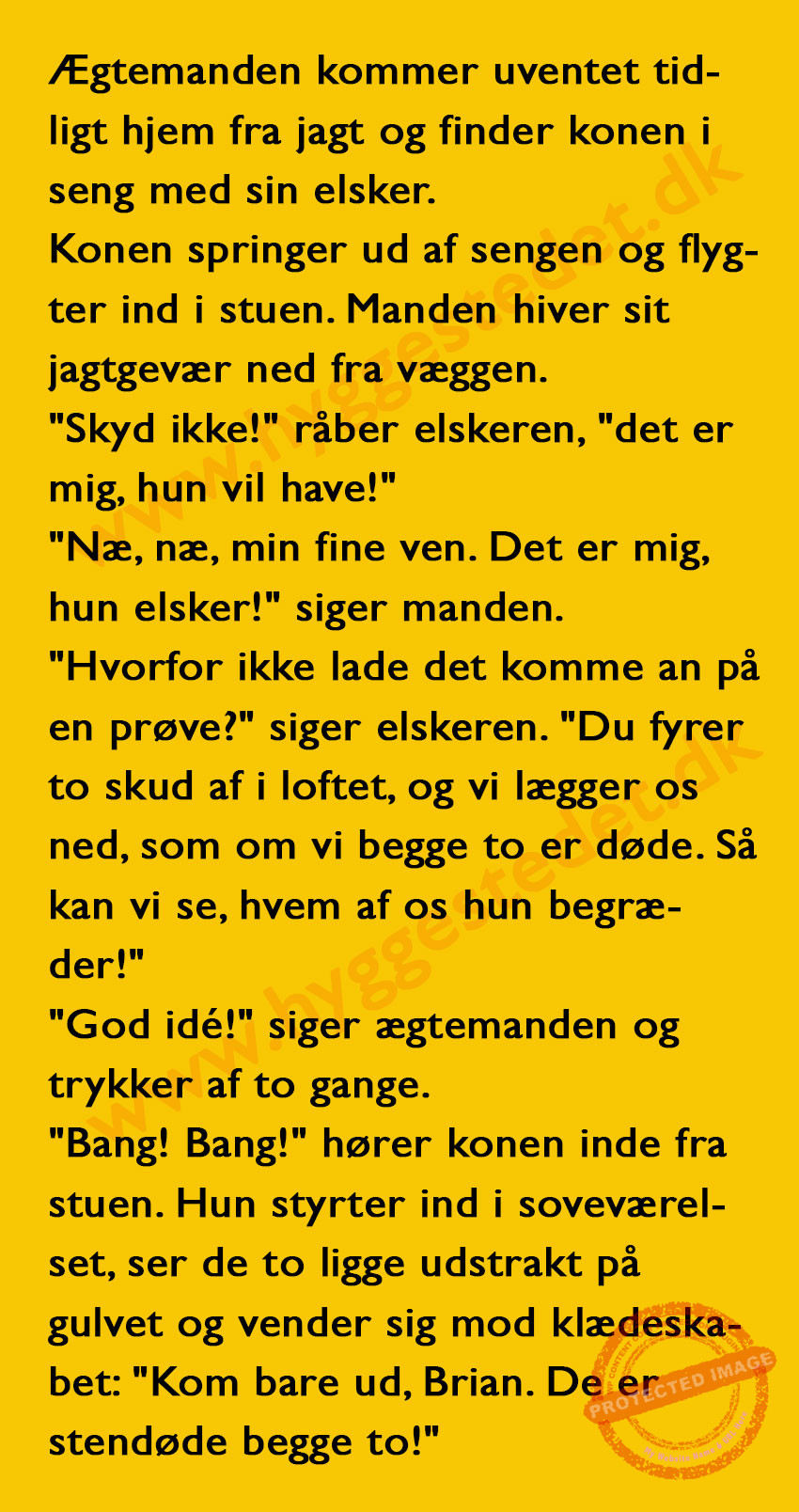 Ægtemanden kommer uventet tidligt hjem fra jagt og finder konen med… Share on Facebook Tweet on Twitter tweet SCROLL NED FOR FLERE SJOVE JOKES! :) RELATED ARTICLESMORE FROM AUTHOR Vittigheder Lille Michael og boliglånet… Vittigheder Lille Michael ønskede sig en cykel i fødselsdagsgave, men forældrene mente ikke der var penge til det… Vittigheder Peter som ikke var helt så kvik skulle ned og købe kondomer for første gang da han havde fået en kæreste… Vittigheder Lille Lasse havde bandet ved aftensbordet og nu mente hans far han skulle have en røvfuld.. Vittigheder Telefonen ringer hos narkopolitiet… Jeg vil gerne anmeldelse min nabo…. Vittigheder Den mest usandsynlige dartspiller går ind på et værtshus Vittigheder En mand går til lægen, fordi han har et problem med, at han prutter konstant…… Vittigheder En kvinde havde en affære med sin mands ven… Vittigheder En lykkelig gift kvinde ville teste sin mands loyalitet og lavede en test til ham… Vittigheder En mand er ude for at købe en ny papegøje og finder en dyrehandel som har 3 forskellige.. Vittigheder En mand går ind til lægen og siger: “Doktor, jeg tror, jeg er blevet en hund!”…. Vittigheder To venner sidder på en bar og snakker om deres forhold…