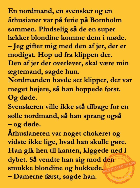 En nordmand, en svensker og en århusianer var på ferie på Bornholm… Share on Facebook Tweet on Twitter tweet nordmandsvenskeraarhus SCROLL NED FOR FLERE SJOVE JOKES! :) RELATED ARTICLESMORE FROM AUTHOR Vittigheder Lille Michael og boliglånet… Vittigheder Lille Michael ønskede sig en cykel i fødselsdagsgave, men forældrene mente ikke der var penge til det… Vittigheder Peter som ikke var helt så kvik skulle ned og købe kondomer for første gang da han havde fået en kæreste… Vittigheder Lille Lasse havde bandet ved aftensbordet og nu mente hans far han skulle have en røvfuld.. Vittigheder Telefonen ringer hos narkopolitiet… Jeg vil gerne anmeldelse min nabo…. Vittigheder Den mest usandsynlige dartspiller går ind på et værtshus Vittigheder En mand går til lægen, fordi han har et problem med, at han prutter konstant…… Vittigheder En kvinde havde en affære med sin mands ven… Vittigheder En lykkelig gift kvinde ville teste sin mands loyalitet og lavede en test til ham… Vittigheder En mand er ude for at købe en ny papegøje og finder en dyrehandel som har 3 forskellige.. Vittigheder En mand går ind til lægen og siger: “Doktor, jeg tror, jeg er blevet en hund!”…. Vittigheder To venner sidder på en bar og snakker om deres forhold…