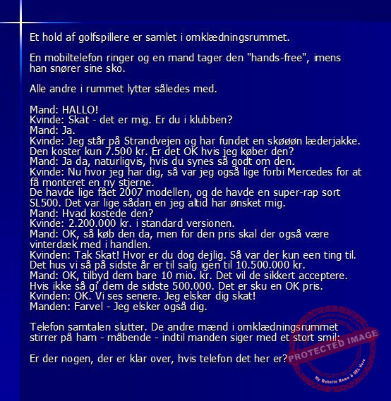 En mobiltelefon ringer hos den smarte mand i golfklubben Share on Facebook Tweet on Twitter tweet SCROLL NED FOR FLERE SJOVE JOKES! :) RELATED ARTICLESMORE FROM AUTHOR Vittigheder Lille Michael og boliglĂĄnet… Vittigheder Lille Michael ønskede sig en cykel i fødselsdagsgave, men forældrene mente ikke der var penge til det… Vittigheder Peter som ikke var helt sĂĄ kvik skulle ned og købe kondomer for første gang da han havde fĂĄet en kæreste… Vittigheder Lille Lasse havde bandet ved aftensbordet og nu mente hans far han skulle have en røvfuld.. Vittigheder Telefonen ringer hos narkopolitiet… Jeg vil gerne anmeldelse min nabo…. Vittigheder Den mest usandsynlige dartspiller gĂĄr ind pĂĄ et værtshus Vittigheder En mand gĂĄr til lægen, fordi han har et problem med, at han prutter konstant…… Vittigheder En kvinde havde en affære med sin mands ven… Vittigheder En lykkelig gift kvinde ville teste sin mands loyalitet og lavede en test til ham… Vittigheder En mand er ude for at købe en ny papegøje og finder en dyrehandel som har 3 forskellige.. Vittigheder En mand gĂĄr ind til lægen og siger: “Doktor, jeg tror, jeg er blevet en hund!”…. Vittigheder To venner sidder pĂĄ en bar og snakker om deres forhold…