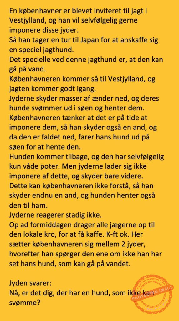 På jagt i Vestjylland… Share on Facebook Tweet on Twitter tweet SCROLL NED FOR FLERE SJOVE JOKES! :) RELATED ARTICLESMORE FROM AUTHOR Vittigheder Lille Michael og boliglånet… Vittigheder Lille Michael ønskede sig en cykel i fødselsdagsgave, men forældrene mente ikke der var penge til det… Vittigheder Peter som ikke var helt så kvik skulle ned og købe kondomer for første gang da han havde fået en kæreste… Vittigheder Lille Lasse havde bandet ved aftensbordet og nu mente hans far han skulle have en røvfuld.. Vittigheder Telefonen ringer hos narkopolitiet… Jeg vil gerne anmeldelse min nabo…. Vittigheder Den mest usandsynlige dartspiller går ind på et værtshus Vittigheder En mand går til lægen, fordi han har et problem med, at han prutter konstant…… Vittigheder En kvinde havde en affære med sin mands ven… Vittigheder En lykkelig gift kvinde ville teste sin mands loyalitet og lavede en test til ham… Vittigheder En mand er ude for at købe en ny papegøje og finder en dyrehandel som har 3 forskellige.. Vittigheder En mand går ind til lægen og siger: “Doktor, jeg tror, jeg er blevet en hund!”…. Vittigheder To venner sidder på en bar og snakker om deres forhold…