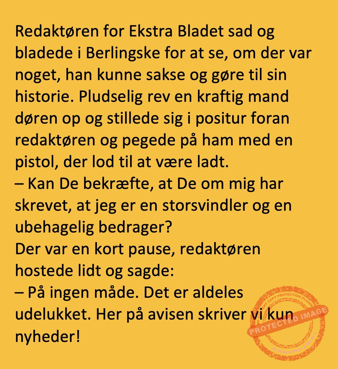 Ekstra Bladets redaktør sad og bladede i Berlingske da en kraftig mand kom ind af døren…. Share on Facebook Tweet on Twitter tweet SCROLL NED FOR FLERE SJOVE JOKES! :) RELATED ARTICLESMORE FROM AUTHOR Vittigheder Lille Michael og boliglånet… Vittigheder Lille Michael ønskede sig en cykel i fødselsdagsgave, men forældrene mente ikke der var penge til det… Vittigheder Peter som ikke var helt så kvik skulle ned og købe kondomer for første gang da han havde fået en kæreste… Vittigheder Lille Lasse havde bandet ved aftensbordet og nu mente hans far han skulle have en røvfuld.. Vittigheder Telefonen ringer hos narkopolitiet… Jeg vil gerne anmeldelse min nabo…. Vittigheder Den mest usandsynlige dartspiller går ind på et værtshus Vittigheder En mand går til lægen, fordi han har et problem med, at han prutter konstant…… Vittigheder En kvinde havde en affære med sin mands ven… Vittigheder En lykkelig gift kvinde ville teste sin mands loyalitet og lavede en test til ham… Vittigheder En mand er ude for at købe en ny papegøje og finder en dyrehandel som har 3 forskellige.. Vittigheder En mand går ind til lægen og siger: “Doktor, jeg tror, jeg er blevet en hund!”…. Vittigheder To venner sidder på en bar og snakker om deres forhold…