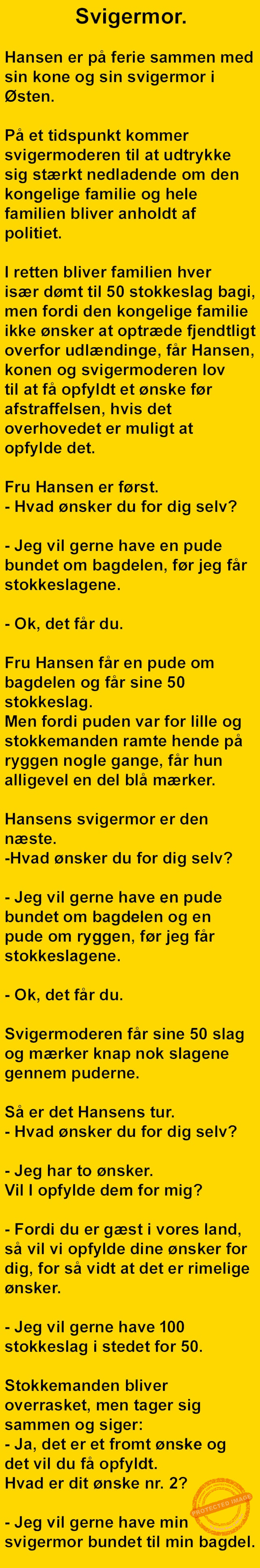 Med svigermor i Østen… Share on Facebook Tweet on Twitter tweet SCROLL NED FOR FLERE SJOVE JOKES! :) RELATED ARTICLESMORE FROM AUTHOR Vittigheder Lille Michael og boliglånet… Vittigheder Lille Michael ønskede sig en cykel i fødselsdagsgave, men forældrene mente ikke der var penge til det… Vittigheder Peter som ikke var helt så kvik skulle ned og købe kondomer for første gang da han havde fået en kæreste… Vittigheder Lille Lasse havde bandet ved aftensbordet og nu mente hans far han skulle have en røvfuld.. Vittigheder Telefonen ringer hos narkopolitiet… Jeg vil gerne anmeldelse min nabo…. Vittigheder Den mest usandsynlige dartspiller går ind på et værtshus Vittigheder En mand går til lægen, fordi han har et problem med, at han prutter konstant…… Vittigheder En kvinde havde en affære med sin mands ven… Vittigheder En lykkelig gift kvinde ville teste sin mands loyalitet og lavede en test til ham… Vittigheder En mand er ude for at købe en ny papegøje og finder en dyrehandel som har 3 forskellige.. Vittigheder En mand går ind til lægen og siger: “Doktor, jeg tror, jeg er blevet en hund!”…. Vittigheder To venner sidder på en bar og snakker om deres forhold…