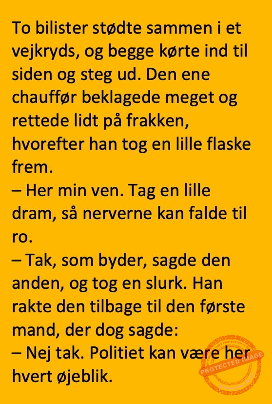 To bilister stødte sammen i et vejkryds Share on Facebook Tweet on Twitter tweet SCROLL NED FOR FLERE SJOVE JOKES! :) RELATED ARTICLESMORE FROM AUTHOR Vittigheder Lille Michael og boliglånet… Vittigheder Lille Michael ønskede sig en cykel i fødselsdagsgave, men forældrene mente ikke der var penge til det… Vittigheder Peter som ikke var helt så kvik skulle ned og købe kondomer for første gang da han havde fået en kæreste… Vittigheder Lille Lasse havde bandet ved aftensbordet og nu mente hans far han skulle have en røvfuld.. Vittigheder Telefonen ringer hos narkopolitiet… Jeg vil gerne anmeldelse min nabo…. Vittigheder Den mest usandsynlige dartspiller går ind på et værtshus Vittigheder En mand går til lægen, fordi han har et problem med, at han prutter konstant…… Vittigheder En kvinde havde en affære med sin mands ven… Vittigheder En lykkelig gift kvinde ville teste sin mands loyalitet og lavede en test til ham… Vittigheder En mand er ude for at købe en ny papegøje og finder en dyrehandel som har 3 forskellige.. Vittigheder En mand går ind til lægen og siger: “Doktor, jeg tror, jeg er blevet en hund!”…. Vittigheder To venner sidder på en bar og snakker om deres forhold…