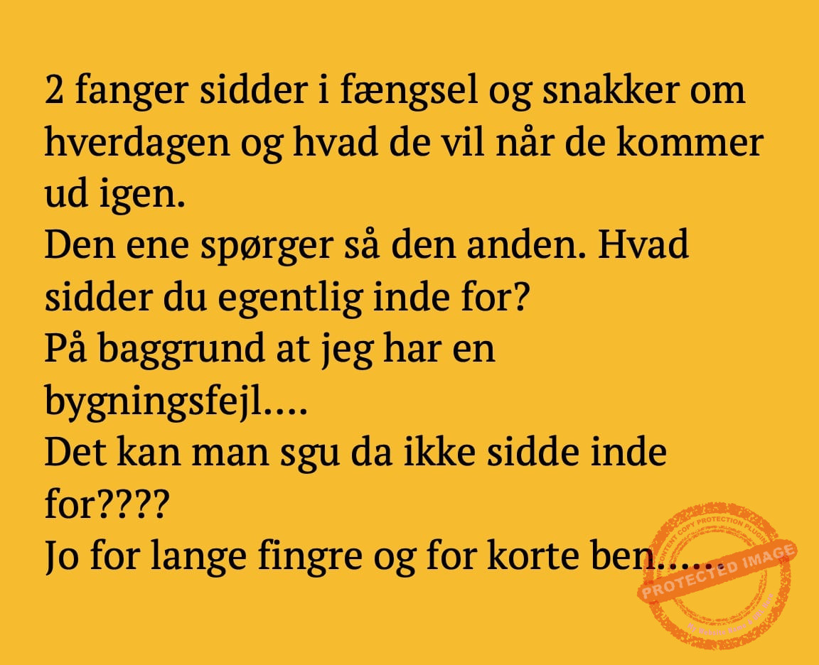 To fanger sidder i fængsel og snakker om hverdagen…. Share on Facebook Tweet on Twitter tweet SCROLL NED FOR FLERE SJOVE JOKES! :) RELATED ARTICLESMORE FROM AUTHOR Vittigheder Lille Michael og boliglånet… Vittigheder Lille Michael ønskede sig en cykel i fødselsdagsgave, men forældrene mente ikke der var penge til det… Vittigheder Peter som ikke var helt så kvik skulle ned og købe kondomer for første gang da han havde fået en kæreste… Vittigheder Lille Lasse havde bandet ved aftensbordet og nu mente hans far han skulle have en røvfuld.. Vittigheder Telefonen ringer hos narkopolitiet… Jeg vil gerne anmeldelse min nabo…. Vittigheder Den mest usandsynlige dartspiller går ind på et værtshus Vittigheder En mand går til lægen, fordi han har et problem med, at han prutter konstant…… Vittigheder En kvinde havde en affære med sin mands ven… Vittigheder En lykkelig gift kvinde ville teste sin mands loyalitet og lavede en test til ham… Vittigheder En mand er ude for at købe en ny papegøje og finder en dyrehandel som har 3 forskellige.. Vittigheder En mand går ind til lægen og siger: “Doktor, jeg tror, jeg er blevet en hund!”…. Vittigheder To venner sidder på en bar og snakker om deres forhold…
