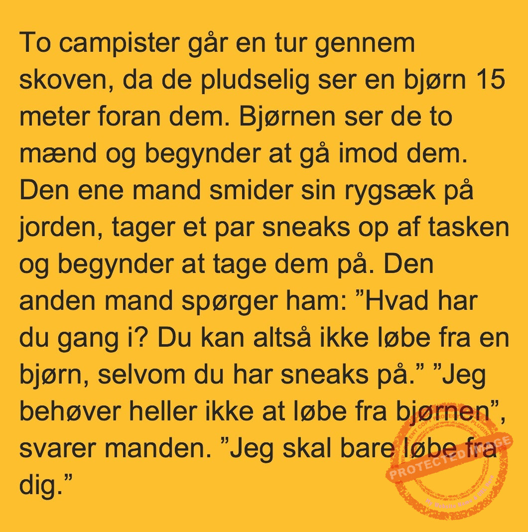 To campister går en tur igennem skoven, da de pludselig ser… Share on Facebook Tweet on Twitter tweet SCROLL NED FOR FLERE SJOVE JOKES! :) RELATED ARTICLESMORE FROM AUTHOR Vittigheder Lille Michael og boliglånet… Vittigheder Lille Michael ønskede sig en cykel i fødselsdagsgave, men forældrene mente ikke der var penge til det… Vittigheder Peter som ikke var helt så kvik skulle ned og købe kondomer for første gang da han havde fået en kæreste… Vittigheder Lille Lasse havde bandet ved aftensbordet og nu mente hans far han skulle have en røvfuld.. Vittigheder Telefonen ringer hos narkopolitiet… Jeg vil gerne anmeldelse min nabo…. Vittigheder Den mest usandsynlige dartspiller går ind på et værtshus Vittigheder En mand går til lægen, fordi han har et problem med, at han prutter konstant…… Vittigheder En kvinde havde en affære med sin mands ven… Vittigheder En lykkelig gift kvinde ville teste sin mands loyalitet og lavede en test til ham… Vittigheder En mand er ude for at købe en ny papegøje og finder en dyrehandel som har 3 forskellige.. Vittigheder En mand går ind til lægen og siger: “Doktor, jeg tror, jeg er blevet en hund!”…. Vittigheder To venner sidder på en bar og snakker om deres forhold…