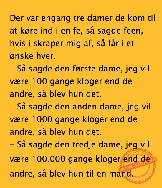 Tre damer kørte ved et uheld en fe over.. Share on Facebook Tweet on Twitter tweet SCROLL NED FOR FLERE SJOVE JOKES! :) RELATED ARTICLESMORE FROM AUTHOR Vittigheder Lille Michael og boliglånet… Vittigheder Lille Michael ønskede sig en cykel i fødselsdagsgave, men forældrene mente ikke der var penge til det… Vittigheder Peter som ikke var helt så kvik skulle ned og købe kondomer for første gang da han havde fået en kæreste… Vittigheder Lille Lasse havde bandet ved aftensbordet og nu mente hans far han skulle have en røvfuld.. Vittigheder Telefonen ringer hos narkopolitiet… Jeg vil gerne anmeldelse min nabo…. Vittigheder Den mest usandsynlige dartspiller går ind på et værtshus Vittigheder En mand går til lægen, fordi han har et problem med, at han prutter konstant…… Vittigheder En kvinde havde en affære med sin mands ven… Vittigheder En lykkelig gift kvinde ville teste sin mands loyalitet og lavede en test til ham… Vittigheder En mand er ude for at købe en ny papegøje og finder en dyrehandel som har 3 forskellige.. Vittigheder En mand går ind til lægen og siger: “Doktor, jeg tror, jeg er blevet en hund!”…. Vittigheder To venner sidder på en bar og snakker om deres forhold…